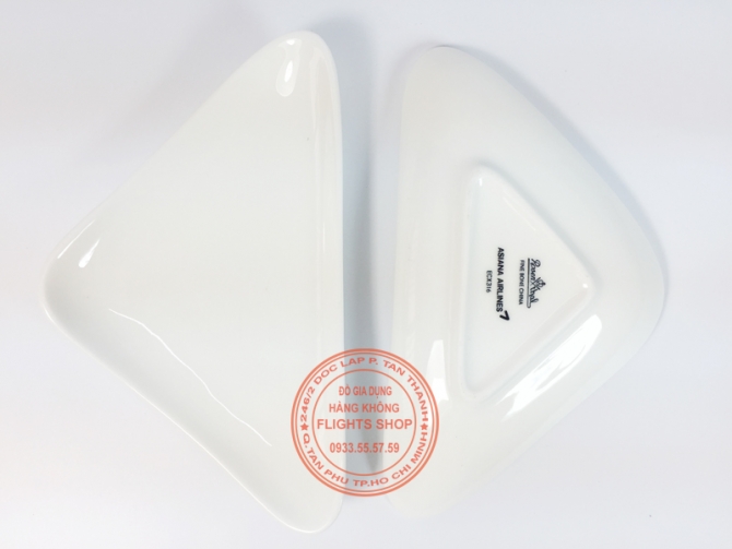 Đĩa đựng nước chấm (nước mắm, tương ớt, muối tiêu...) tam giác của Asiana Airlines. Sứ xương cao cấp từ Hàn Quốc, không giòn, không lỗi. Men sứ trắng tinh, dày dặn và đẹp. Chiều dài cạnh 12cm, cạnh nhỏ 8cm. Có logo Asiana Airlines dưới đáy. Hàng dùng trên khoang hạng thương gia của Asiana Airlines.